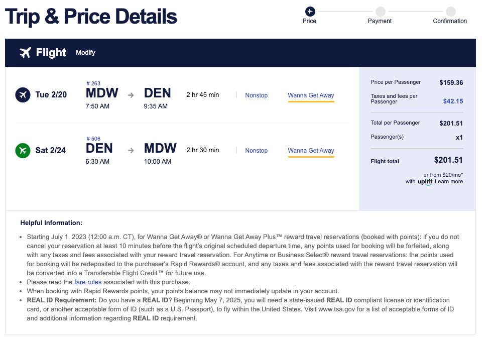 Both flights bring this round-trip total to just over $200 for a Wanna Get Away fare.