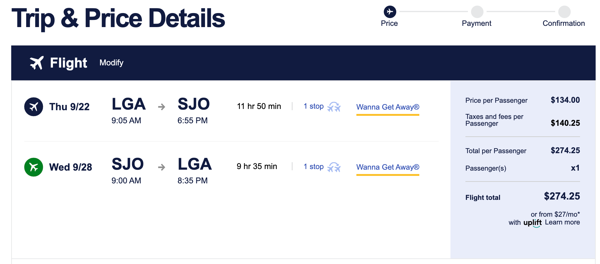 Flights from LaGuardia Airport (LGA) to Juan Santamaría International Airport (SJO) in San Jose, Costa Rica, can be booked in September for as little as $274.25 round-trip. We saw lots of availability for this route in September and October so if your schedule is flexible, it could help you find a great bargain.