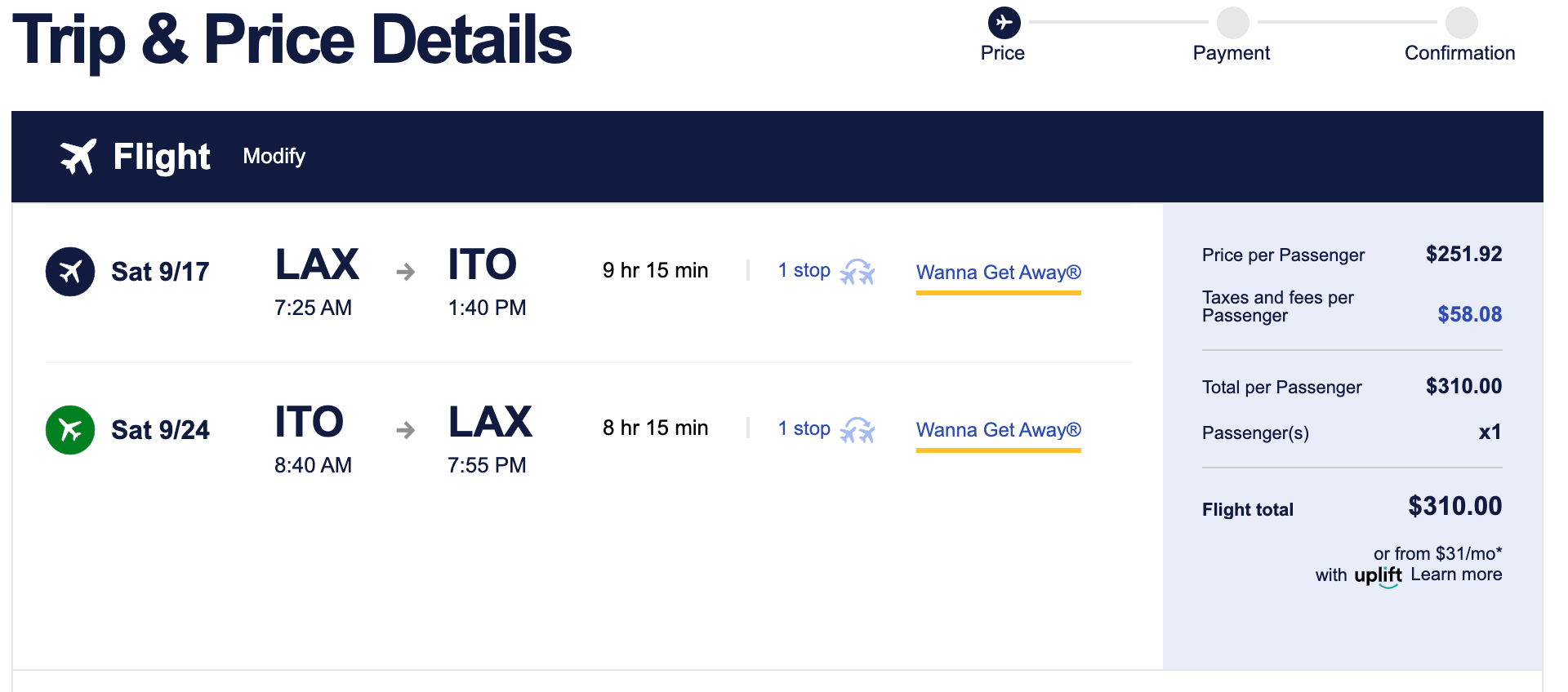 Routes: Select flights from various cities to a variety of destinations, including Honolulu; Hilo, Hawaii; Cancun, Mexico; Puerto Vallarta, Mexico; and Belize.