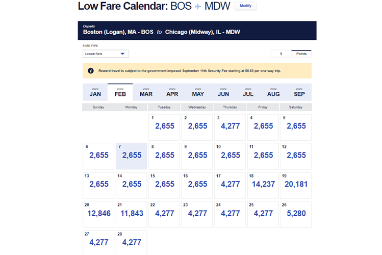 - Boston (BOS) to and from Chicago (MDW), for 2,655 miles.