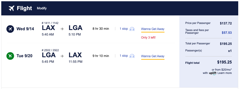 The LAX-to-LGA route that we found starting at $195 is for travel from Sept. 14 to Sept. 20. For this long of a flight, we're impressed with the price point.