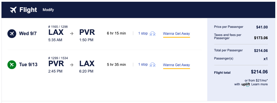 For an international flight, LAX to PVR for just $214 is pretty impressive by our standards, even with a layover.