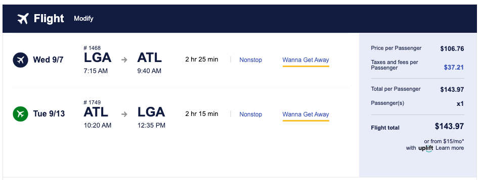 From LGA to ATL is also a nonstop flight, starting at $144 for the same dates.