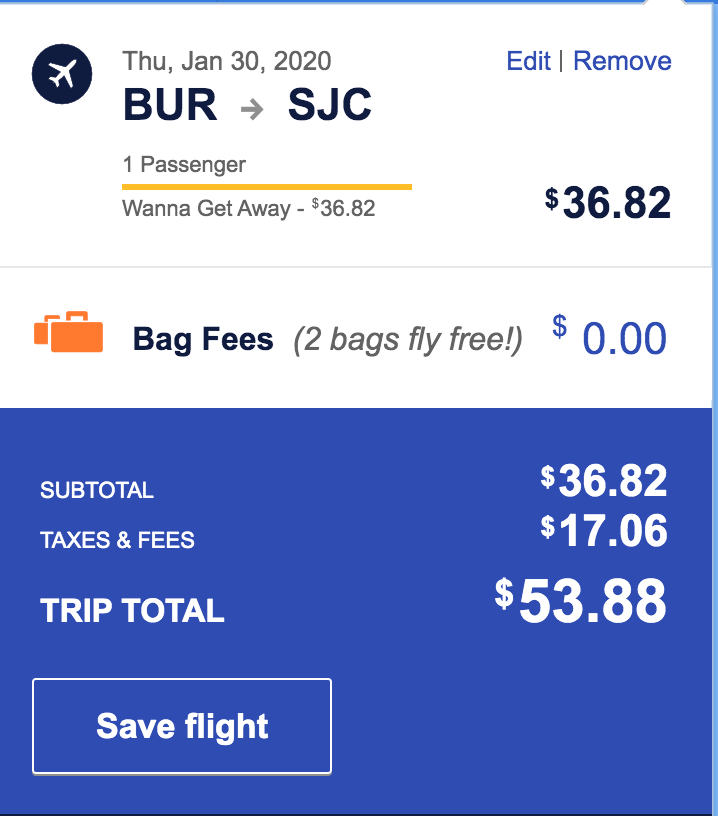Burbank (BUR) to San Jose (SJC) for $54 one-way nonstop: