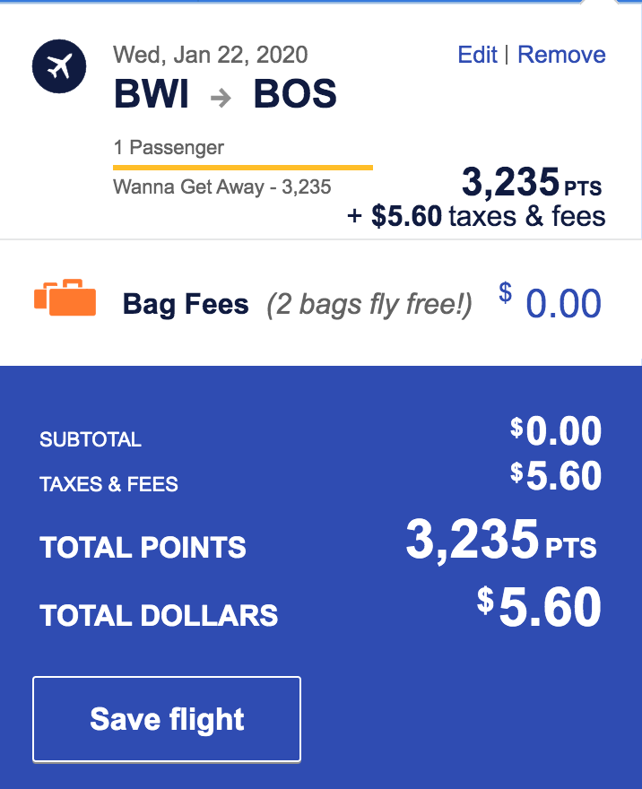 Baltimore (BWI) to Boston (BOS) for 3,235 + $5.60 one-way nonstop: