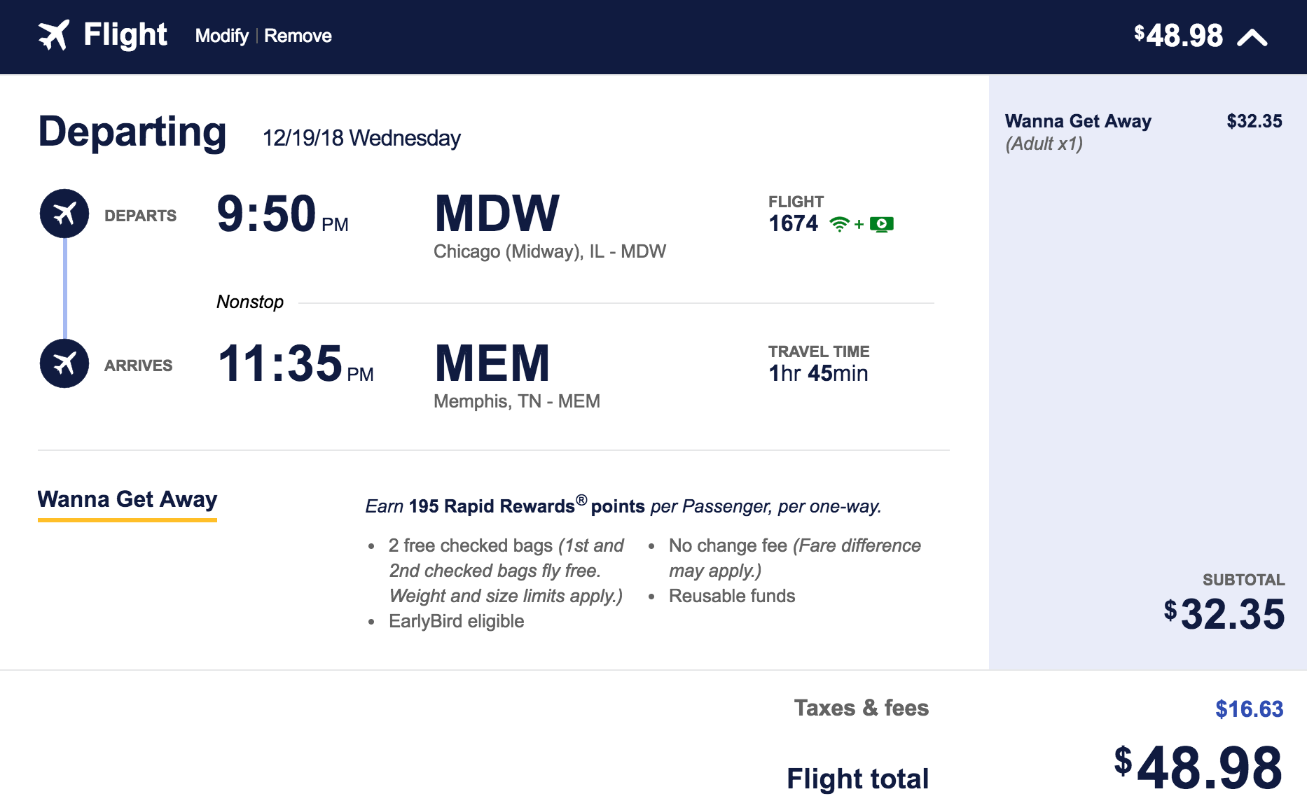 Chicago (MDW) to Memphis (MEM) for $49 one-way: