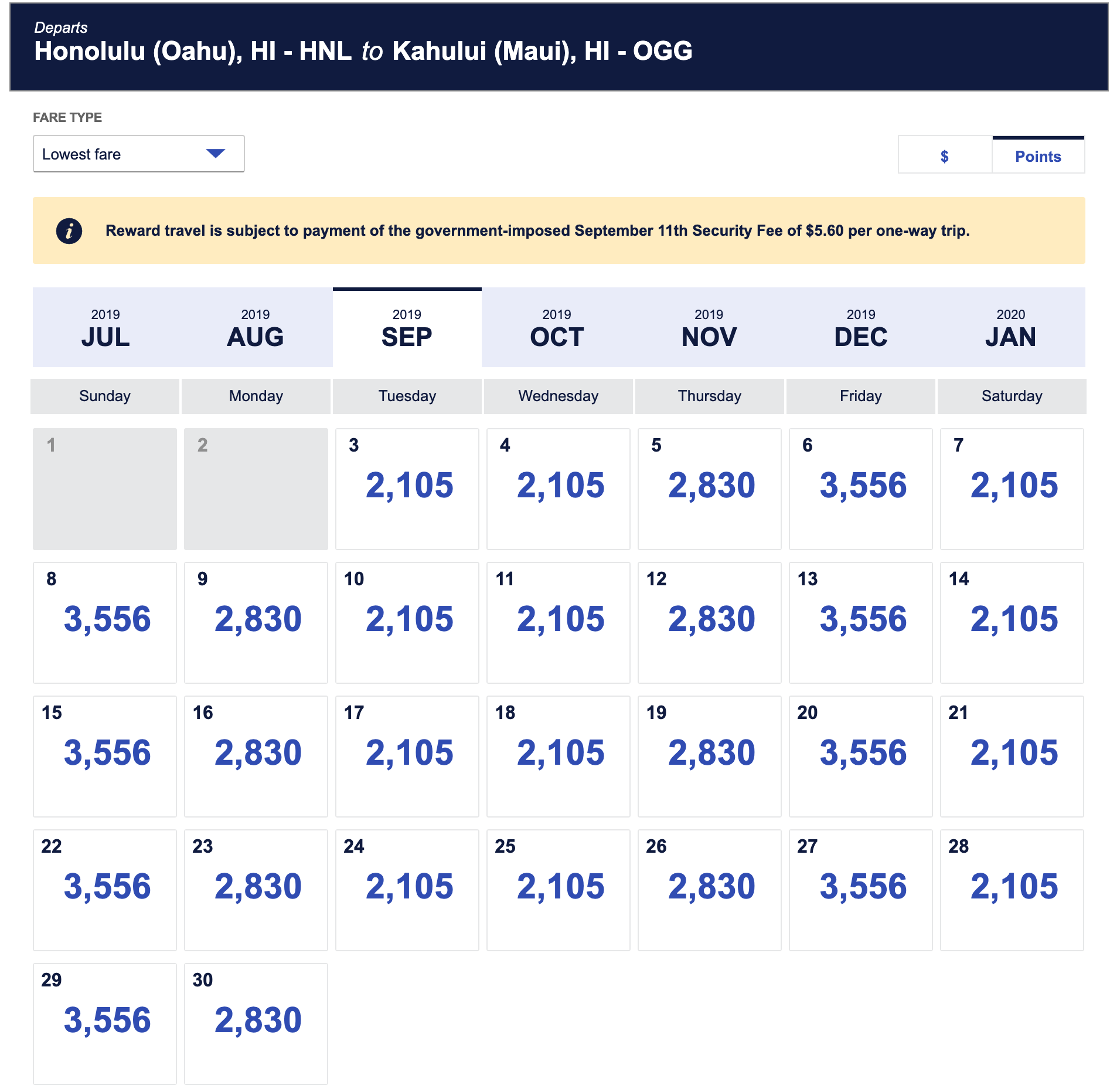 Honolulu (HNL) to Kahului (OGG) for 2,105 Southwest Points + $5.60 one-way: