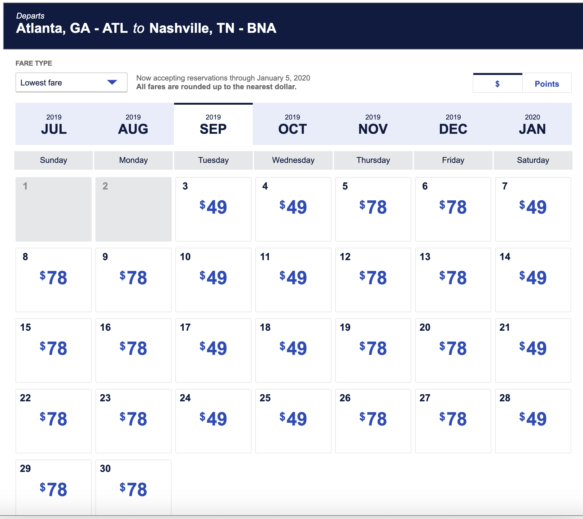 Atlanta (ATL) to Nashville (BNA) for $49 one-way: