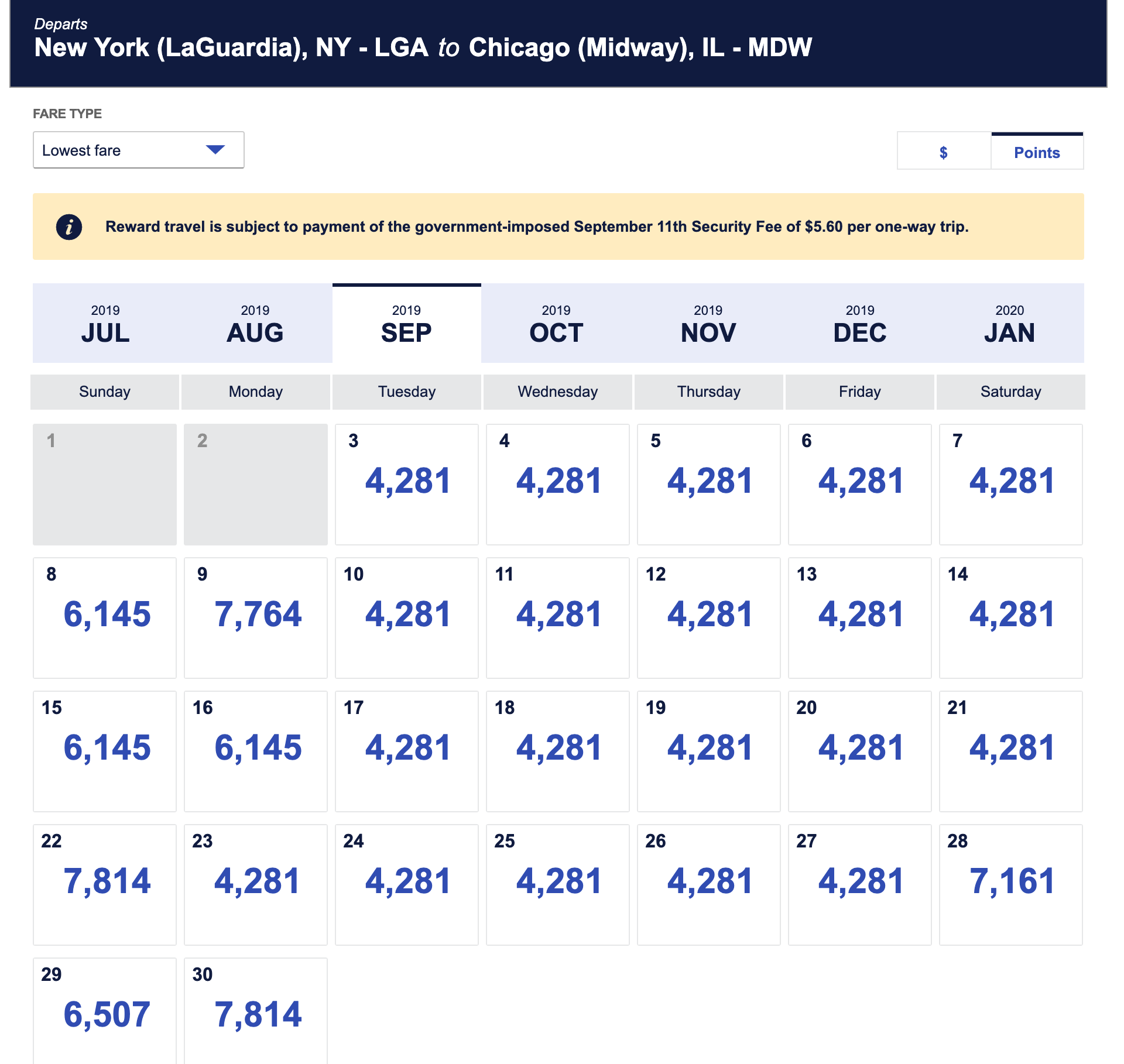 New York (LGA) to Chicago (MDW) for 4,281 Southwest points + $5.60 one-way: