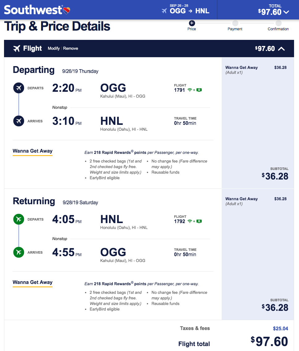 Maui (OGG) to Honolulu (HNL) for $98 round-trip nonstop: