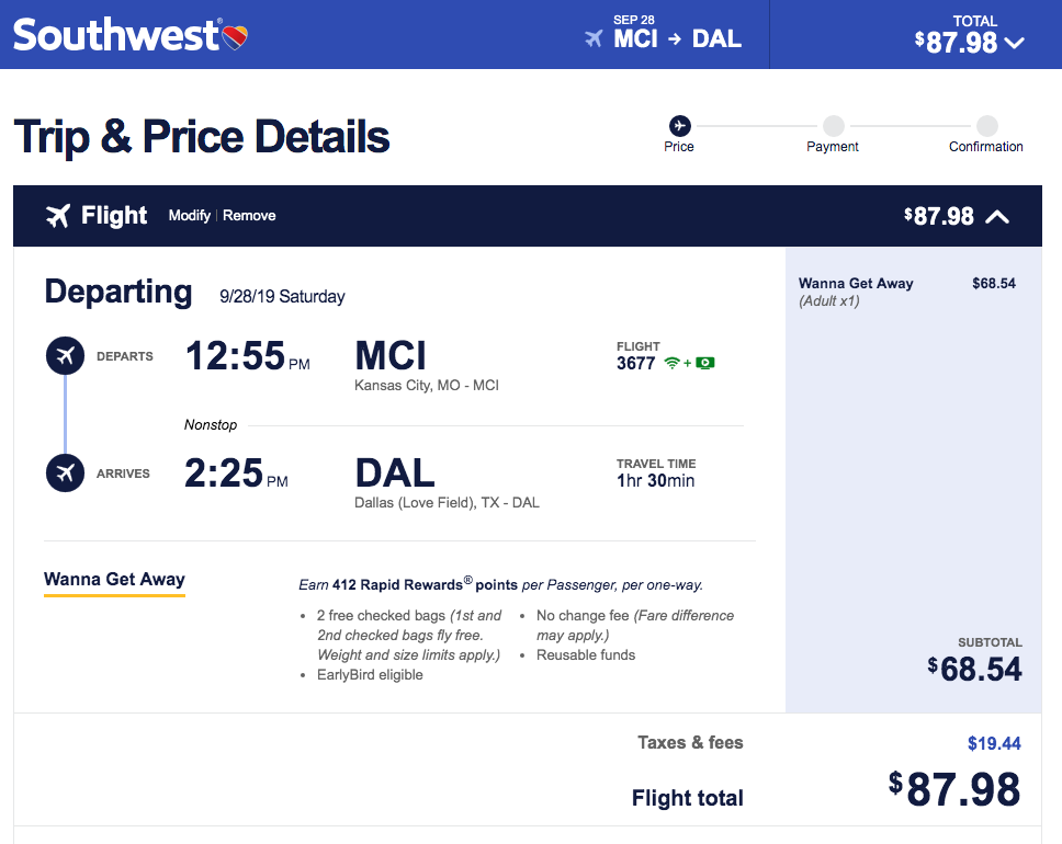 Kansas City (MCI) to Dallas (DAL) for $88 one-way: