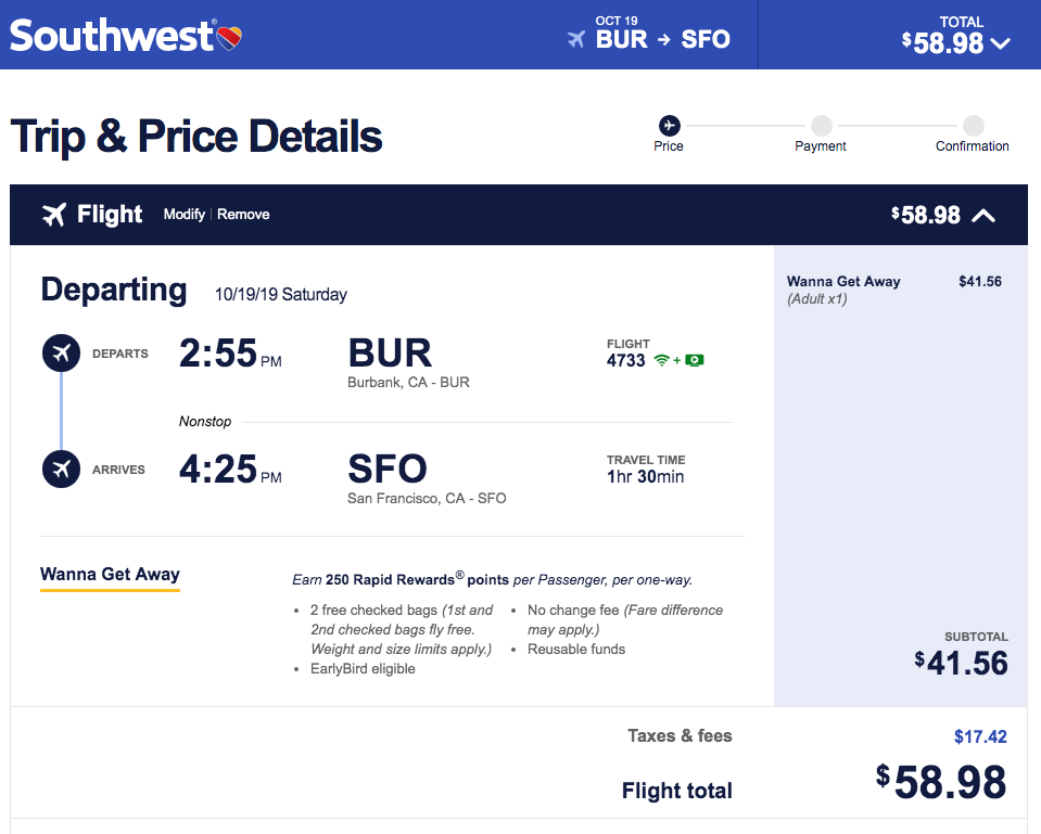 Burbank (BUR) to San Francisco (SFO) for $59 one-way: