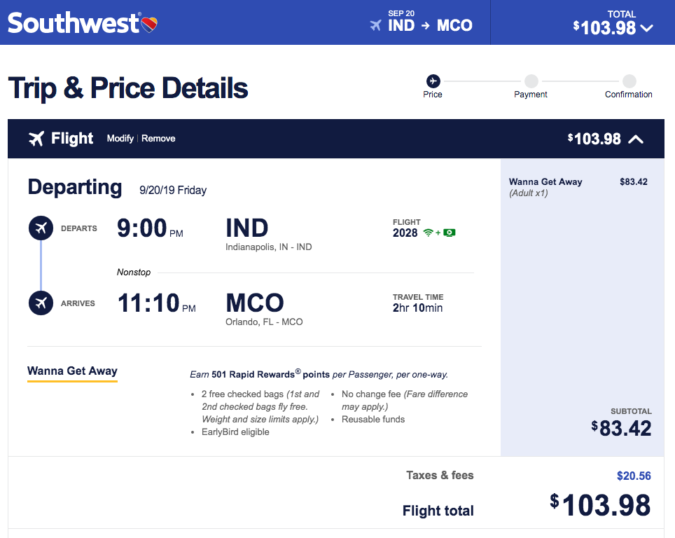 Indianapolis (IND) to Orlando (MCO) for $104 one way: