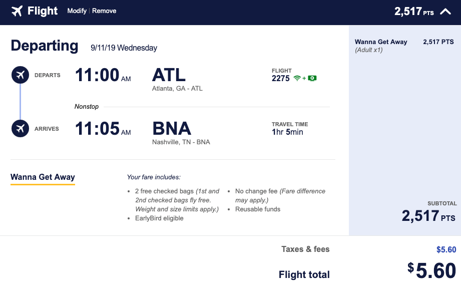 Atlanta (ATL) to Nashville (BNA) for 2,517 points + $5.60 one-way: