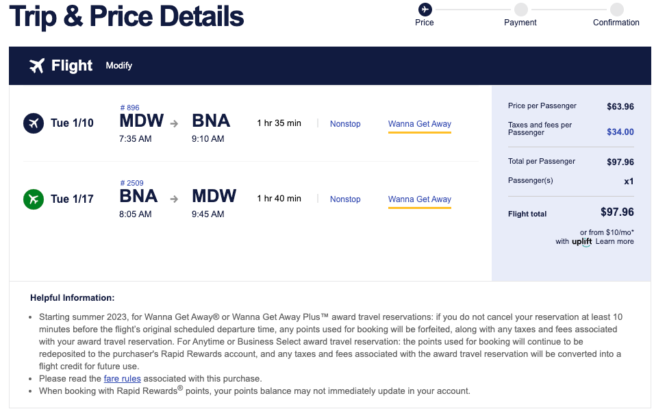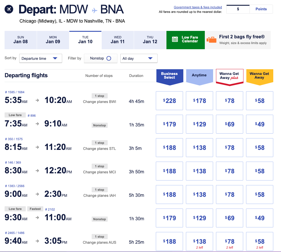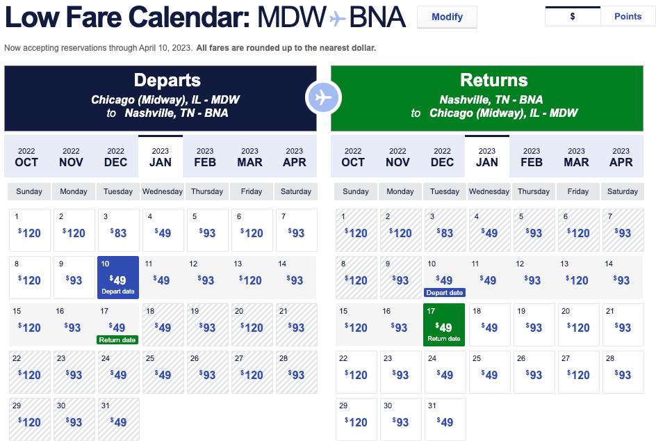 For example, you could book a round-trip journey between MDW and BNA for $97 for mid-January. Once you hit search, be sure to filter results by "nonstop" and select the $49 flights from there.