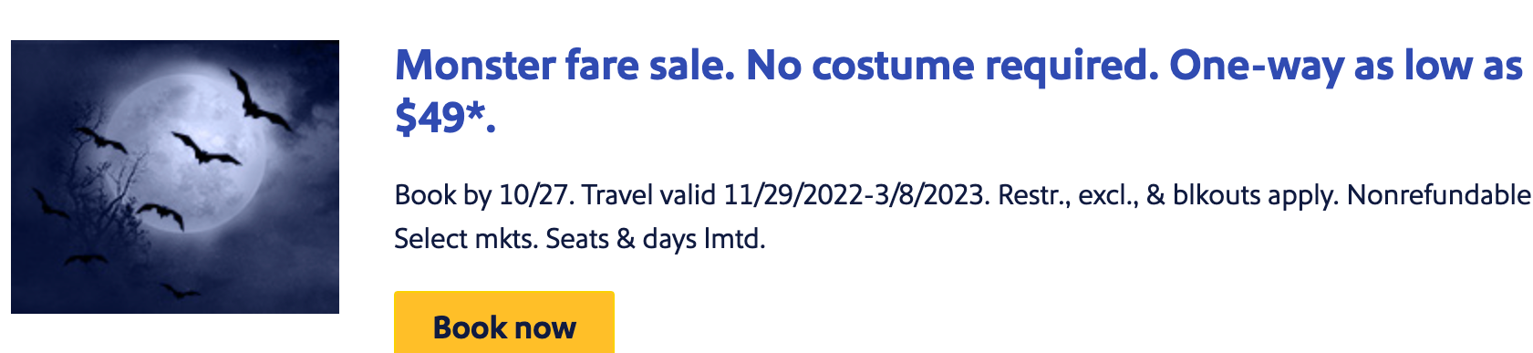 Halloween is next week, and Southwest Airlines is celebrating with a Monster Sale: Travelers can book one-way flights starting at just $49, no costume required.