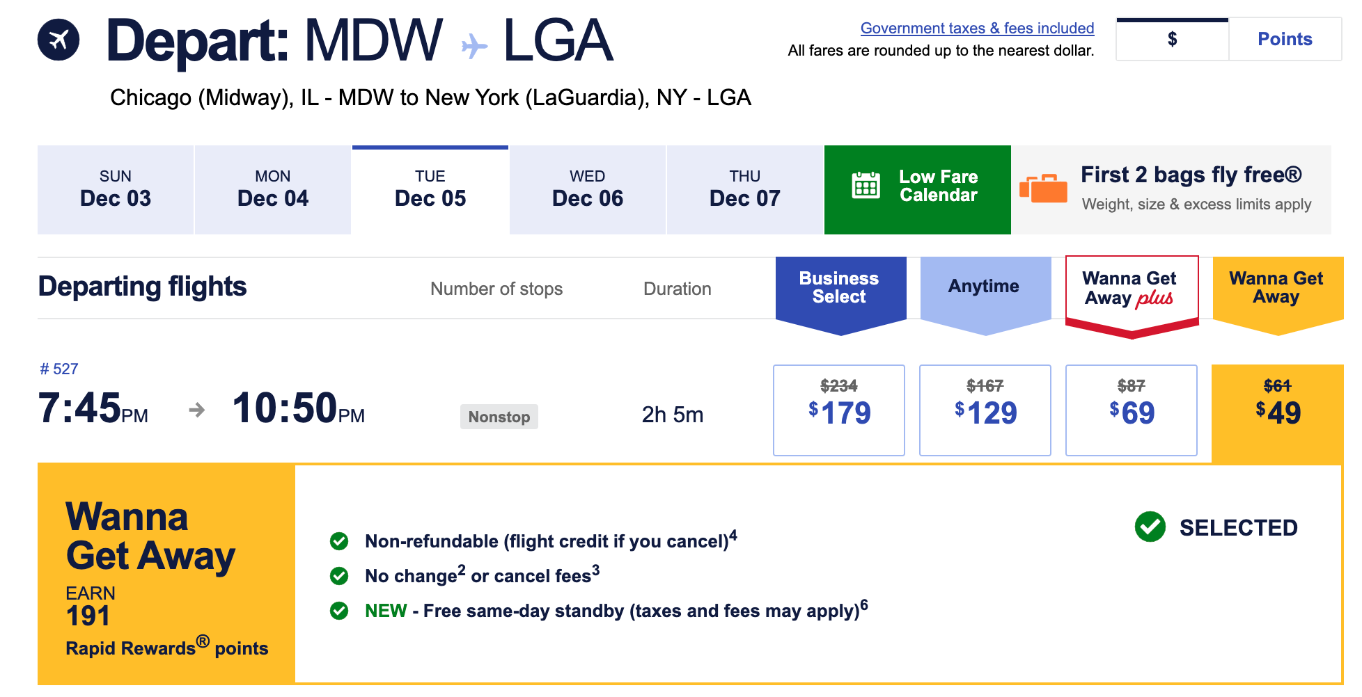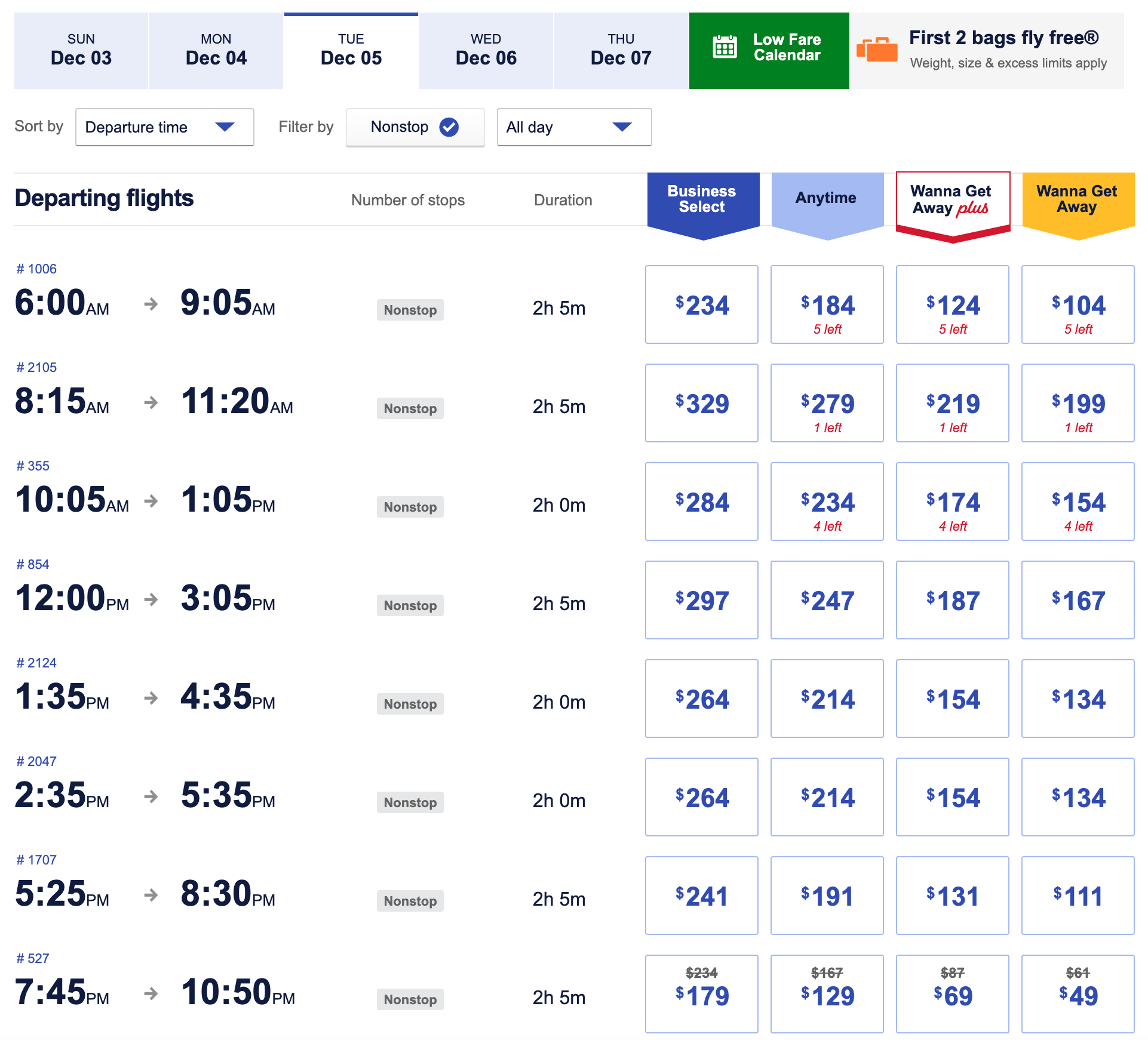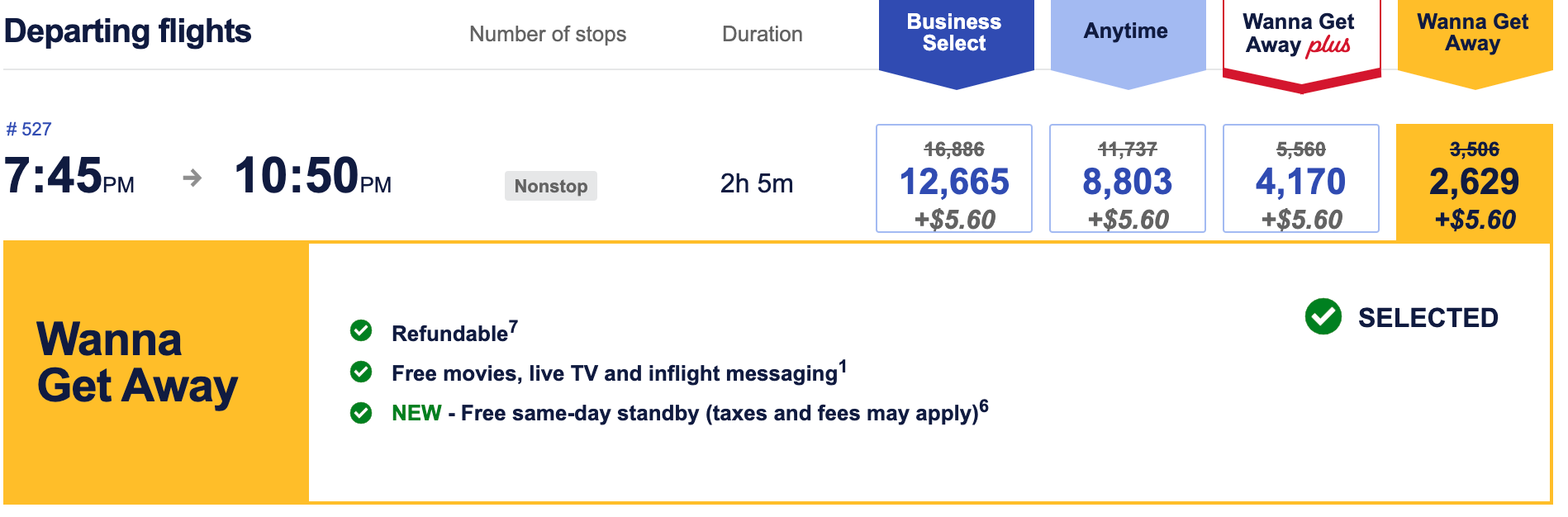 This same flight can be booked for 2,629 points plus $5.60. Based on TPG's current valuation of Rapid Rewards points at 1.35 cents per point, you can save a small amount by using Rapid Rewards points to book this flight.