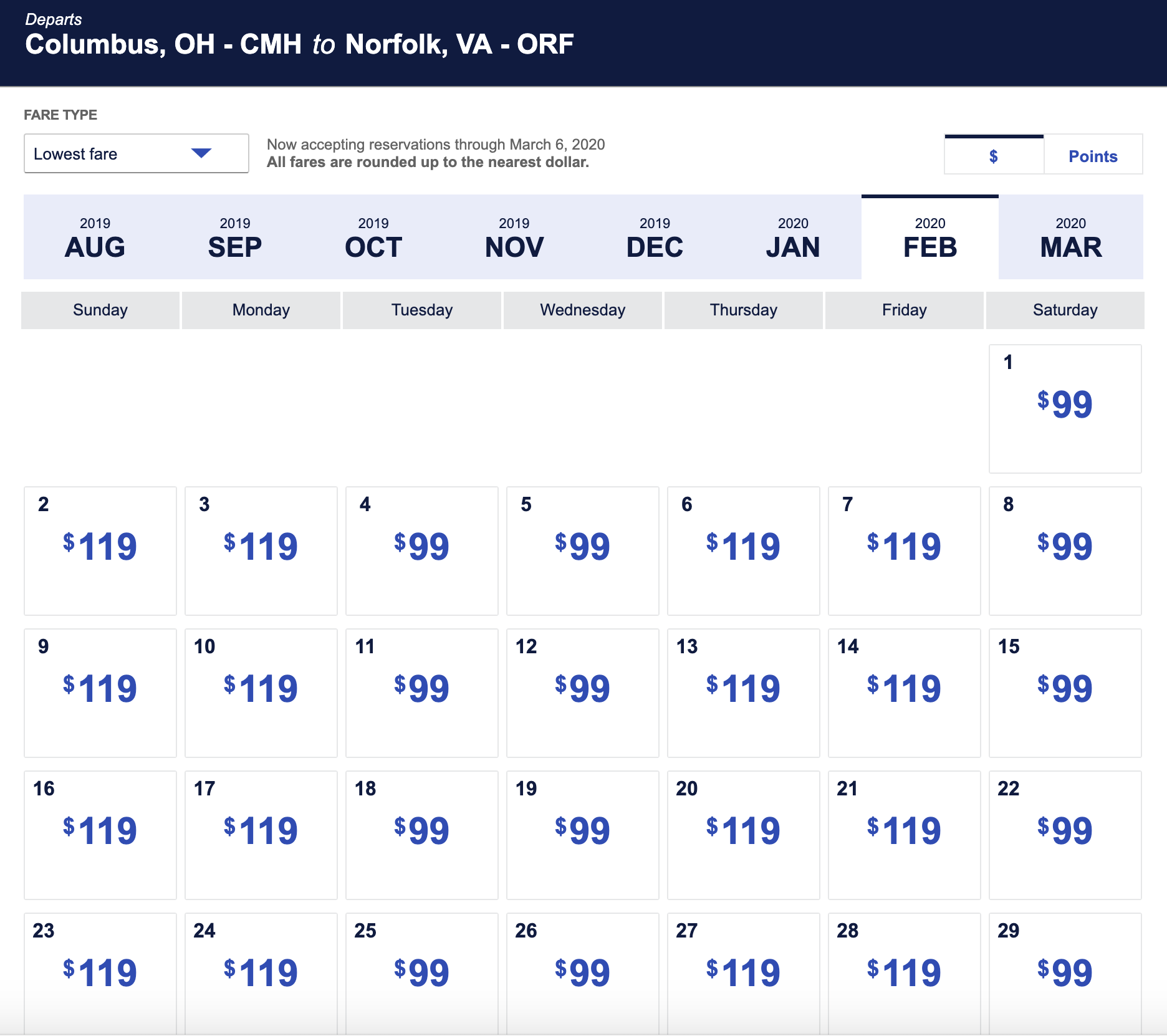 Columbus (CMH) to Norfolk (ORF) for $99 one-way: