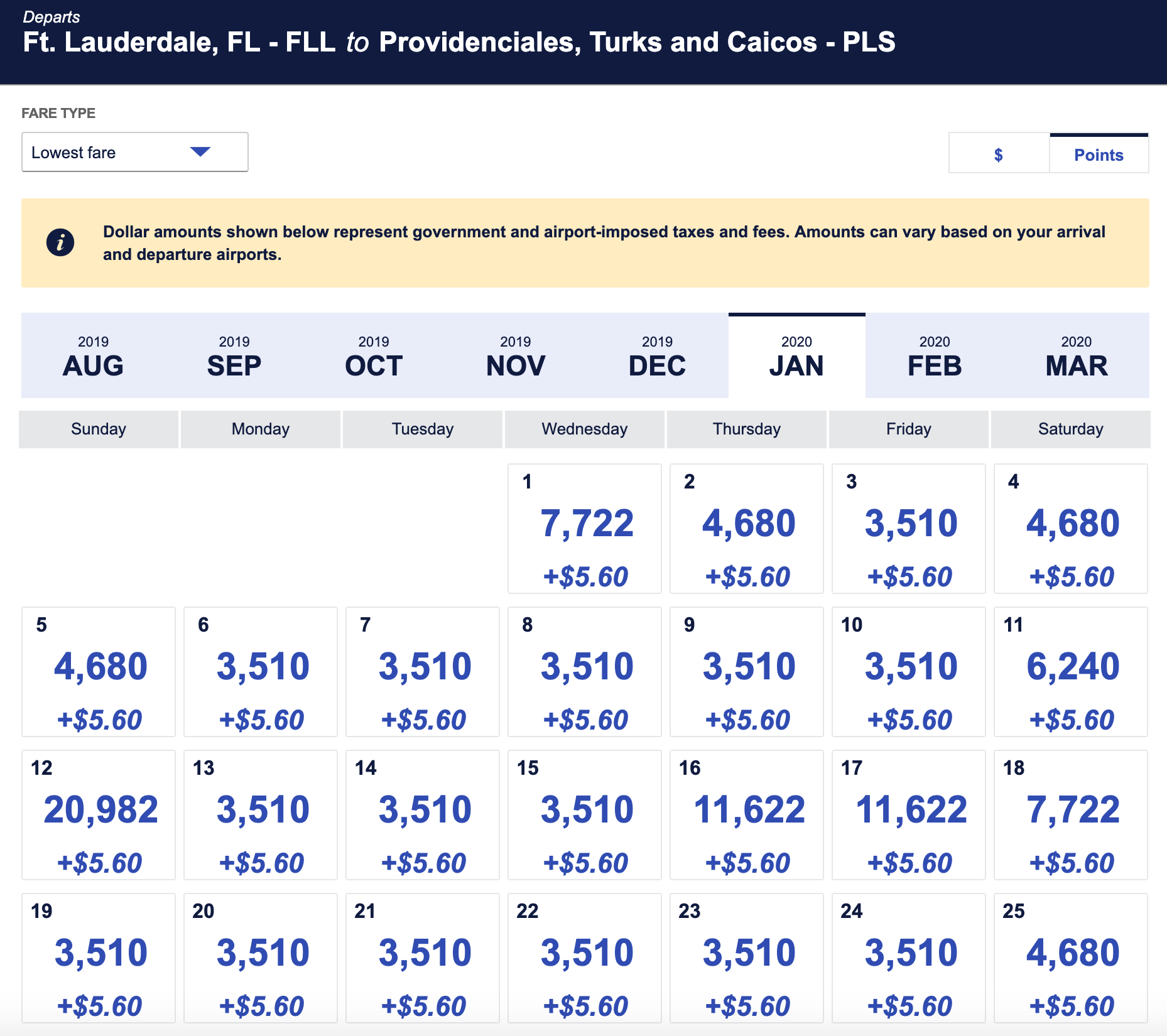 Ft. Lauderdale (FLL) to Turks and Caicos (PLS) from 3,510 points + $5.60 one-way: