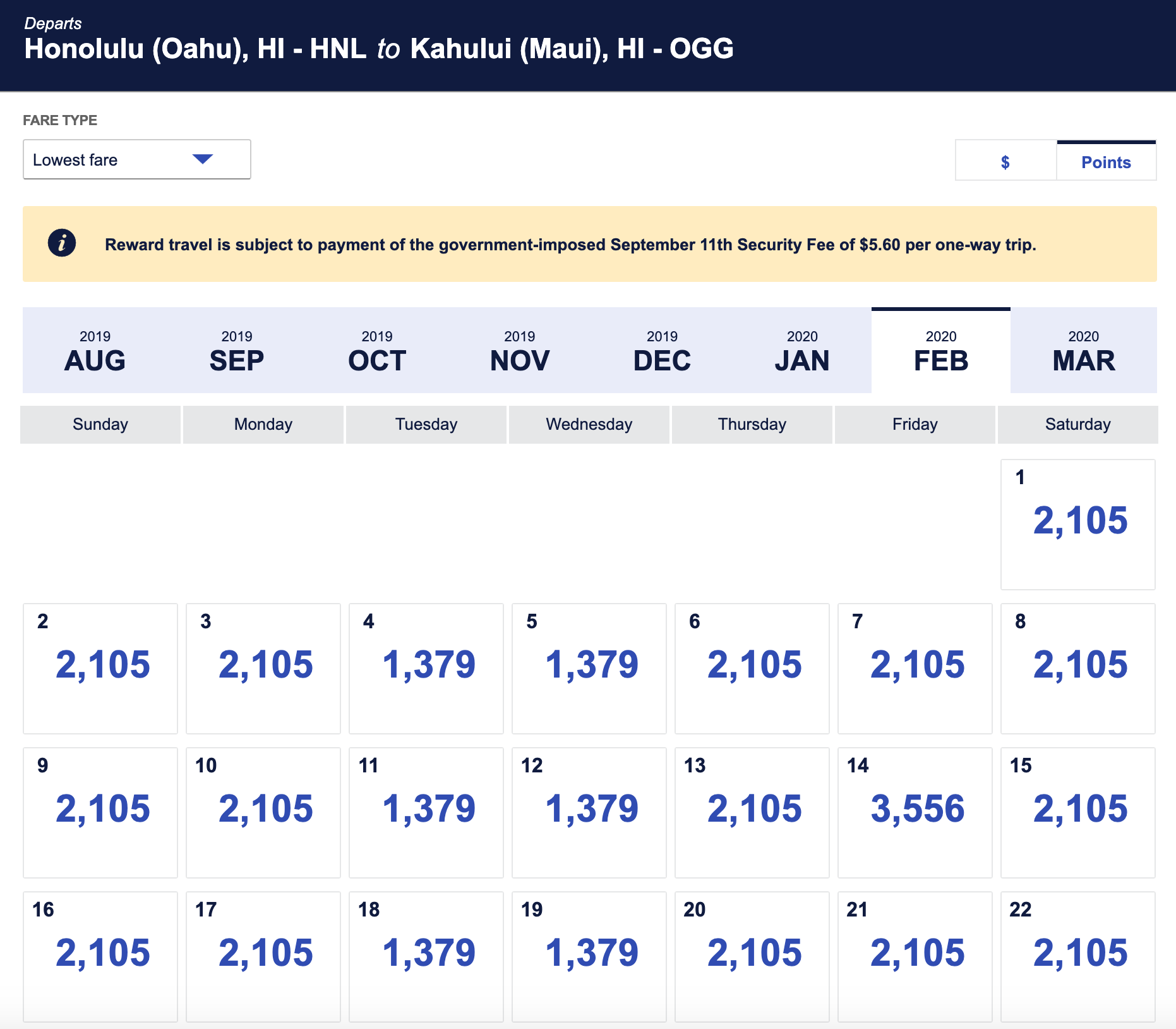 Honolulu (HNL) to Maui (OGG) from 1,379 points + $5.60 one-way: