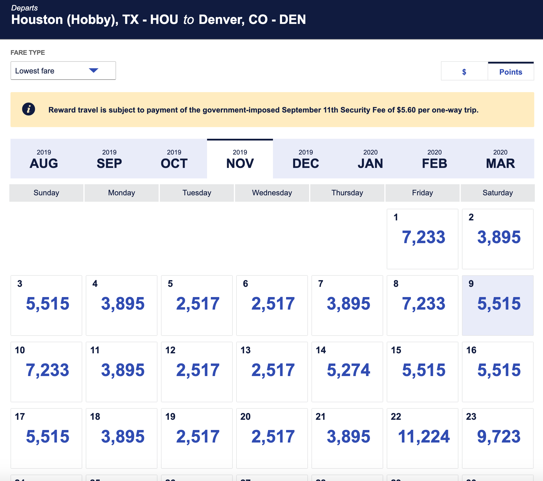 Houston (HOU) to Denver (DEN) from 2,517 points + $5.60 one-way: