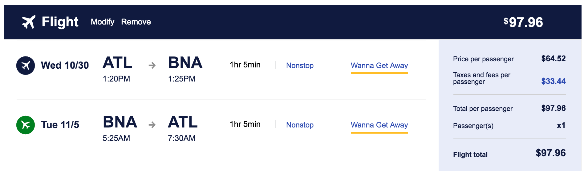 Atlanta (ATL) to Nashville (BNA) for $49 one-way or $98 round-trip nonstop: