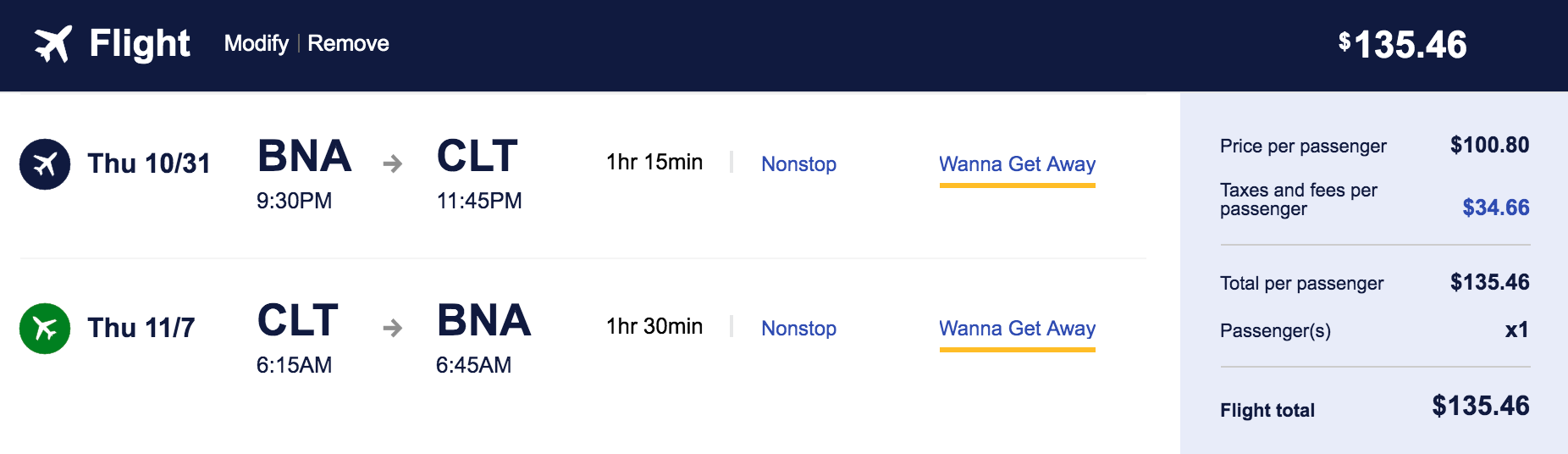 Nashville (BNA) to Charlotte (CLT) for $69 one-way or $135 round-trip nonstop: