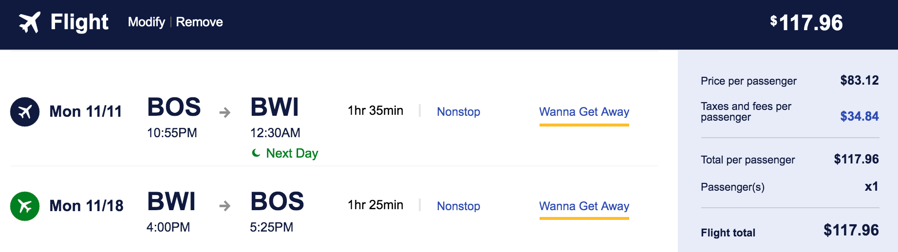 Boston (BOS) to Baltimore (BWI) for $59 one-way or $118 round-trip nonstop: