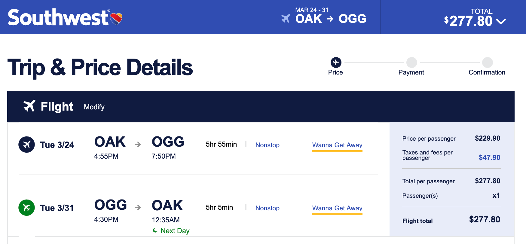 Oakland (OAK) to Maui (OGG) for $278 round -trip nonstop: