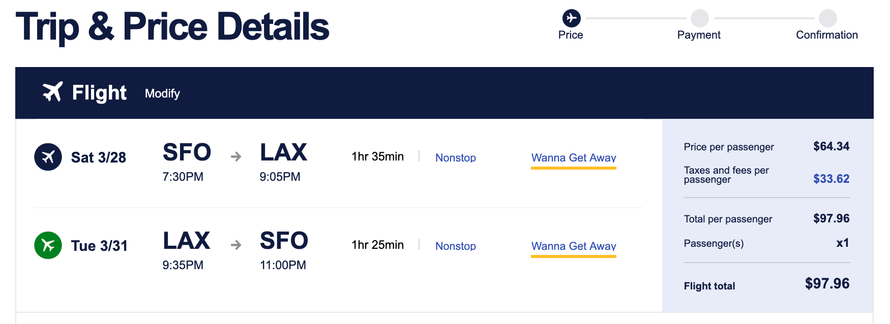 San Francisco (SFO) to Los Angeles (LAX) for $98 round-trip nonstop: