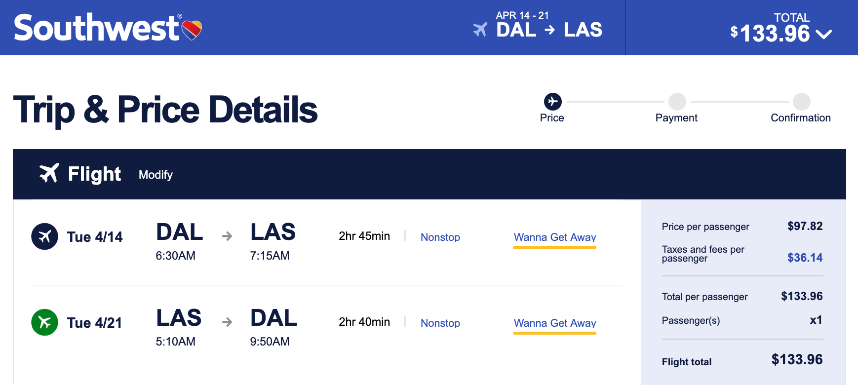 Dallas (DAL) to Las Vegas (LAS) for $134 round-trip nonstop: