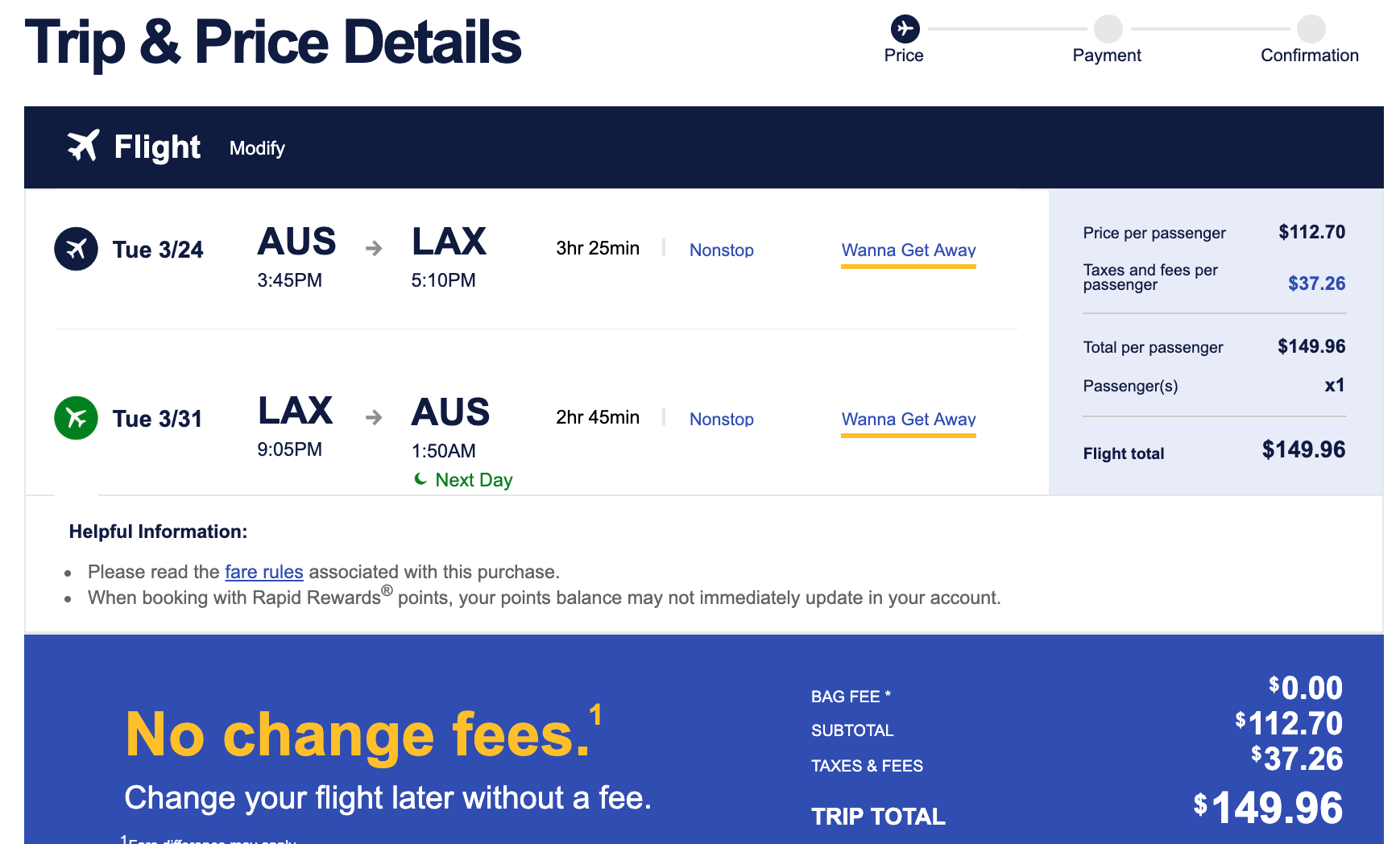 Hawaii interisland fares begin at $39 or 2,139 Rapid Rewards points one way, while mainland fares begin at $49 one-way and $98 round-trip, or 2,830 Rapid Rewards points each way. Hawaii fares to and from the mainland begin at $139 one-way or $278 round-trip nonstop from the West Coast.