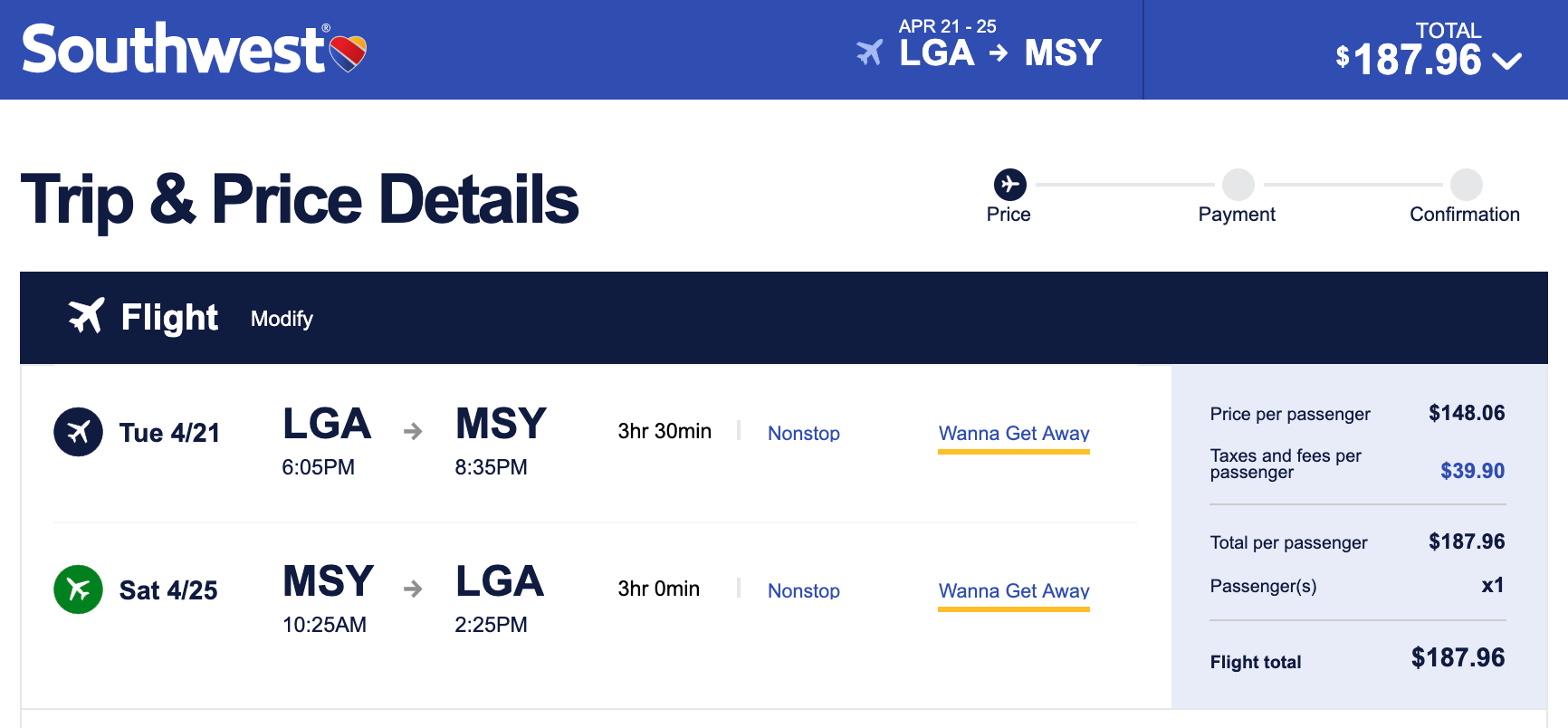 New York (LGA) to New Orleans (MSY) for $188 round-trip nonstop:
