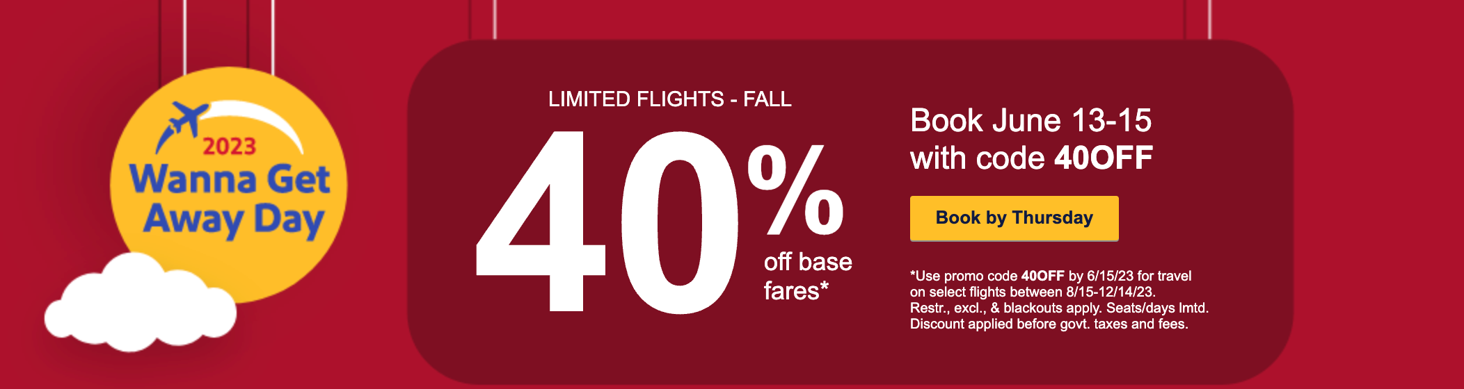 Travelers can also get up to 40% off base fares for fall flights that are booked by Thursday. Book online with the code "40OFF" for travel between Aug. 15 and Dec. 14. This deal is valid for travel booked by 11:59 p.m. PDT on Thursday. Blackout dates apply, including Nov. 16-27.