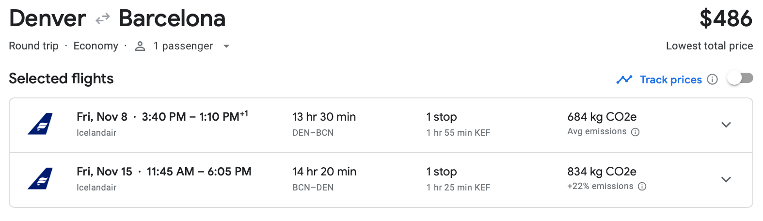 Icelandair has fares from Denver International Airport (DEN) to BCN in November for less than $500 round-trip.