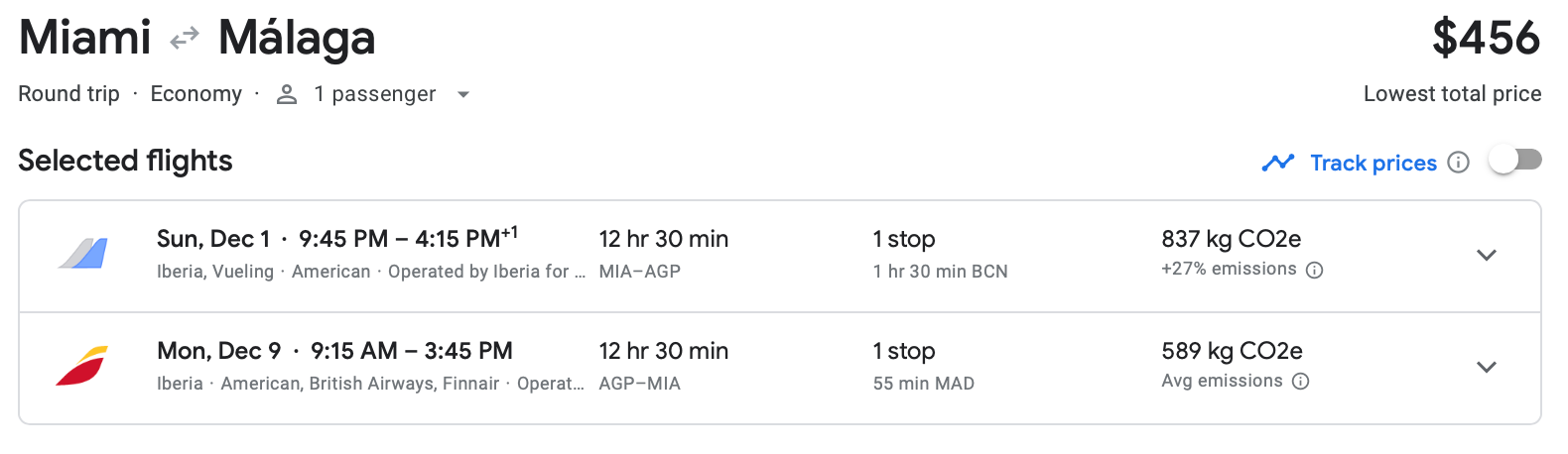 You can fly from Miami International Airport (MIA) to AGP in Malaga for just $456 round-trip on Iberia. This flight falls at the start of the winter holiday season.