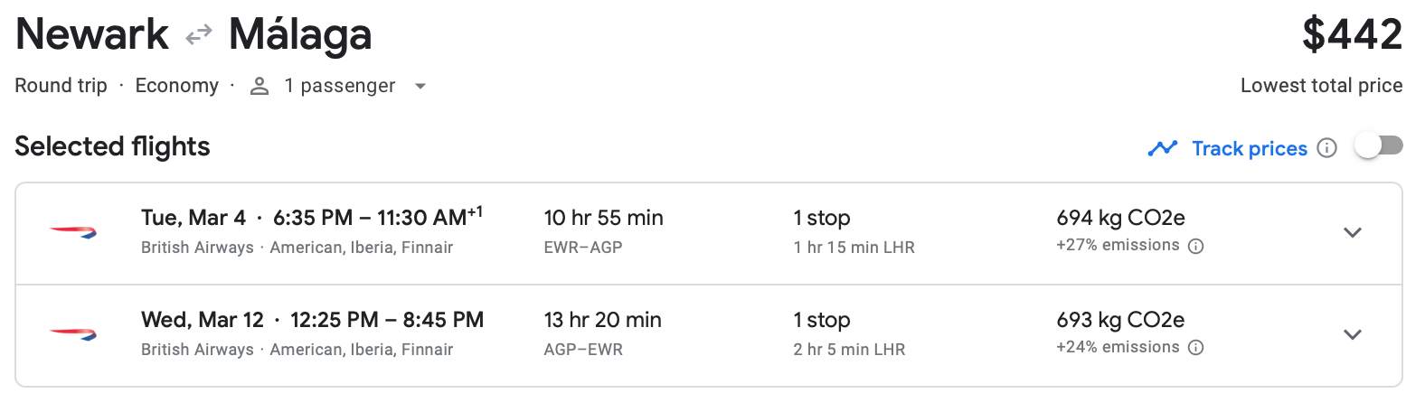 British Airways has fares in March from Newark Liberty International Airport (EWR) to AGP for only $442 round-trip.