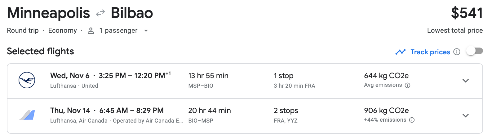 You can book an itinerary from Minneapolis to BIO in November for as low as $541 round-trip on Lufthansa. Please note the return trip includes two stops.
