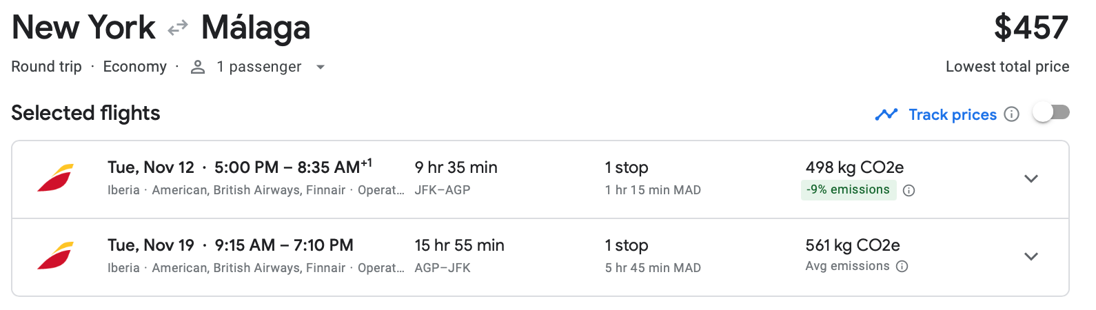 You can fly Iberia from New York City's John F. Kennedy Airport (JFK) to AGP in November for $457 round-trip.