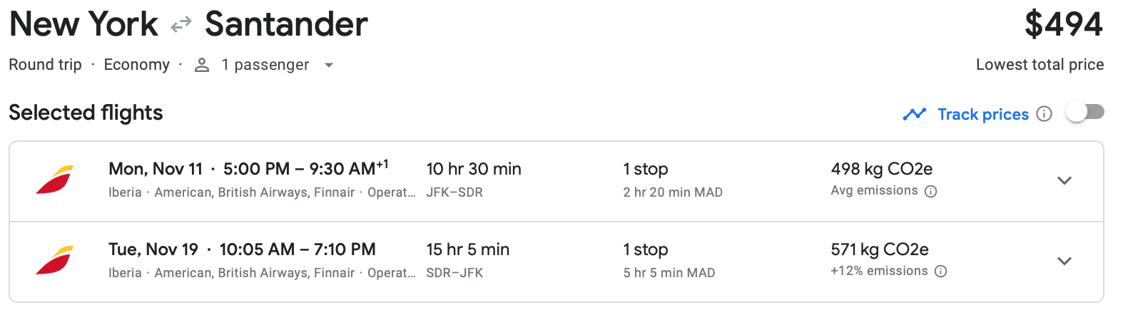 There are also good deals on flights from New York to Santander on Spain's northern coast. This itinerary from JFK to SDR in November is available on Iberia for less than $500 round-trip.