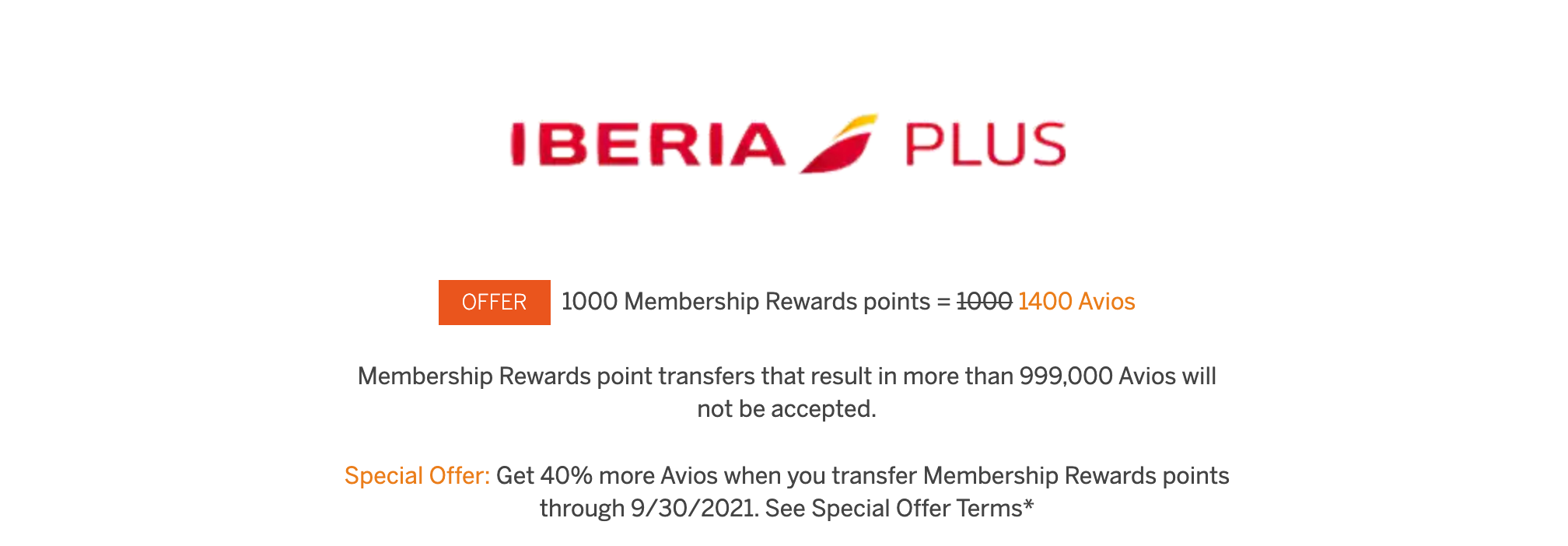 As a reminder, your points transfer to Iberia Plus at a 1:1 ratio for both Membership Rewards and Chase Ultimate Rewards. Note that Ultimate Rewards points transfer instantly, while Amex Membership Rewards points can take up to 48 hours.