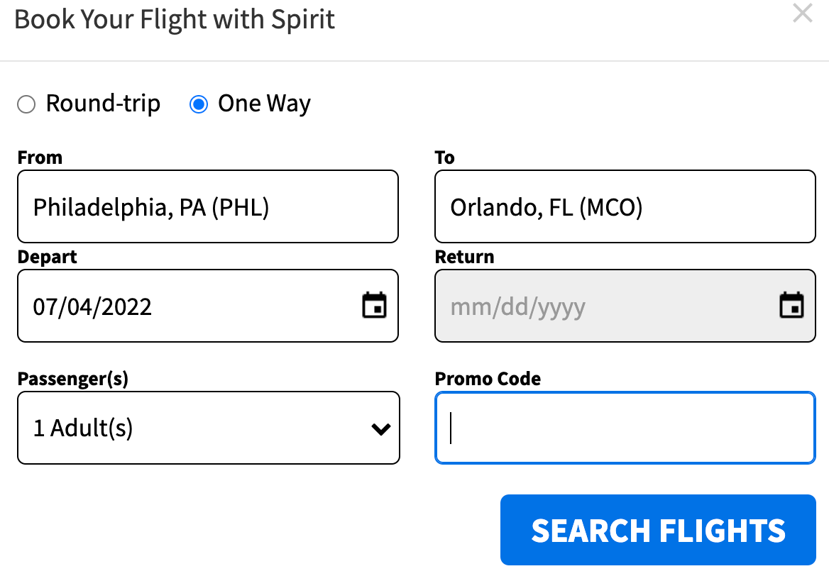 To book this deal, head directly to the Spirit website and book a flight as you would normally, but be sure to enter the promo code "60PCT" before you hit "search flights."