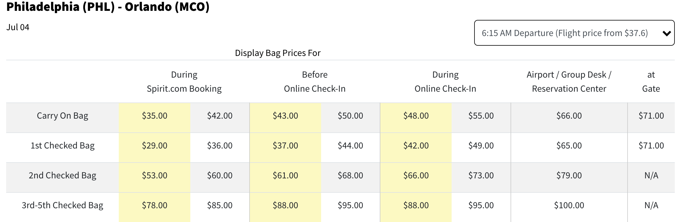As is the case with ultra-low-cost carriers, expect to pay a significant amount to check luggage, in addition to checking a seat. Although all Spirit fares allow one personal item (around 18x14x8 inches), you can pay $35 to bring on a larger carry-on item for the overhead bin or $42.00 to check your first bag during the booking process. Should you want to add on baggage later, you can do so for a higher price.
