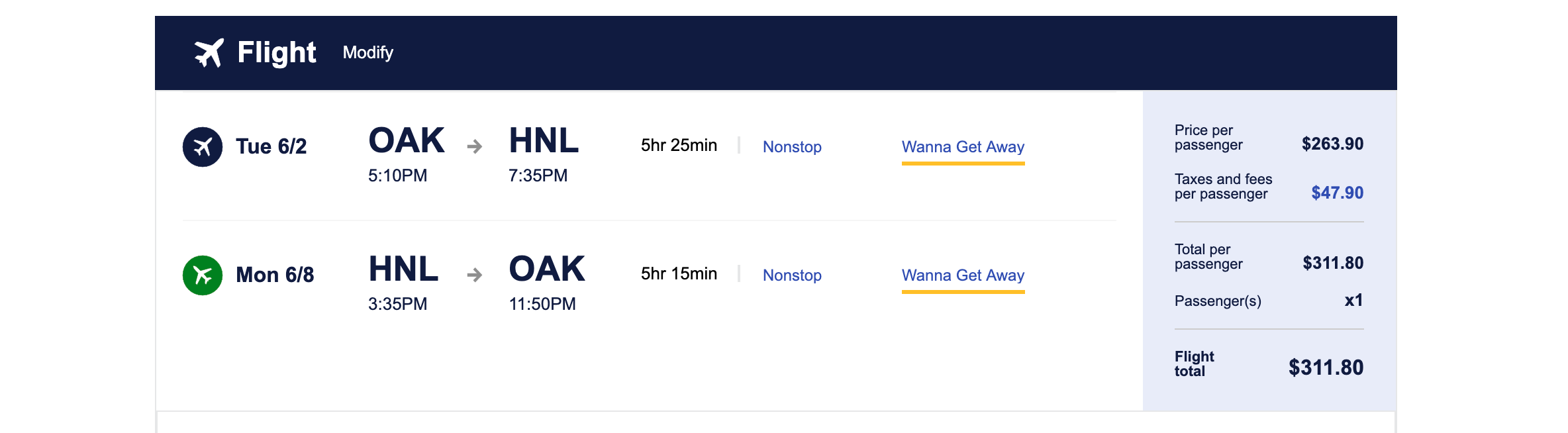 Oakland (OAK) to Honolulu (HNL) for $312 round-trip on Southwest in early June: