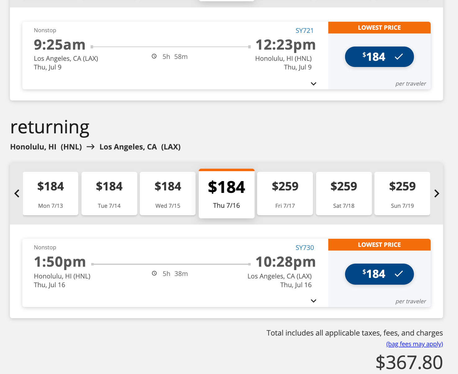Los Angeles (LAX) to Honolulu (HNL) for $368 round-trip nonstop on Sun Country Airlines in July: