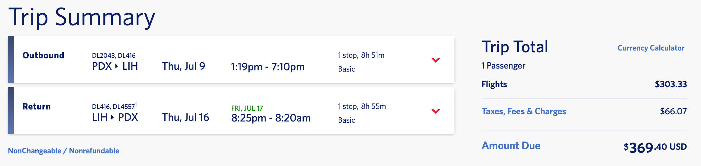 Portland (PDX) to Kauai (LIH) for $369 round-trip on Delta in basic economy in July: