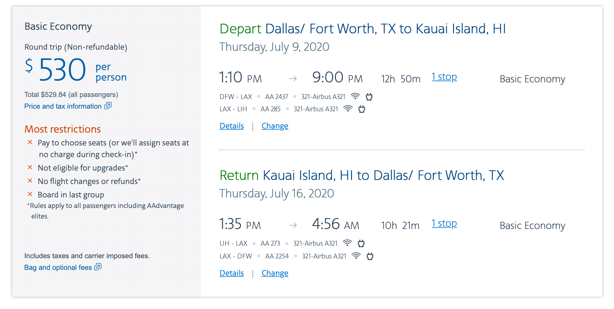 Dallas (DFW) to Kauai (LIH) for $520 round-trip on American basic economy in July: