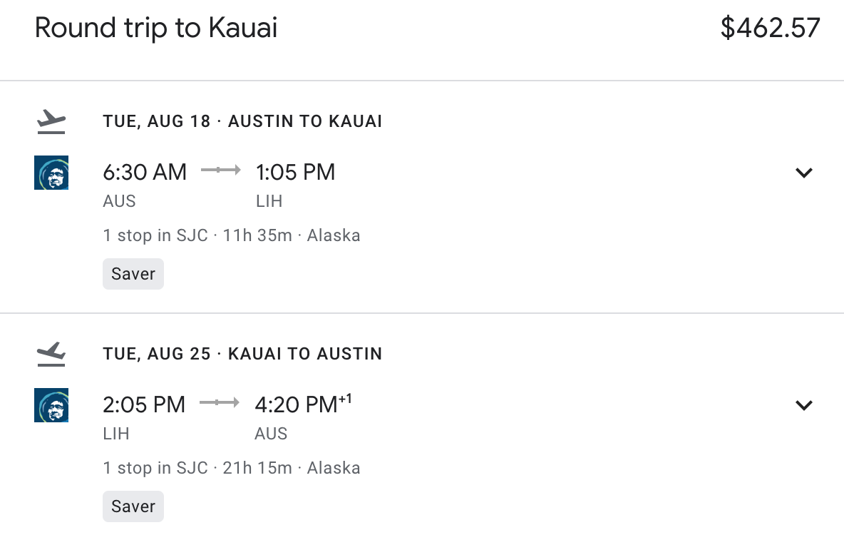 Austin (AUS) to Kauai (LIH) for $463 round-trip on Alaska in August: