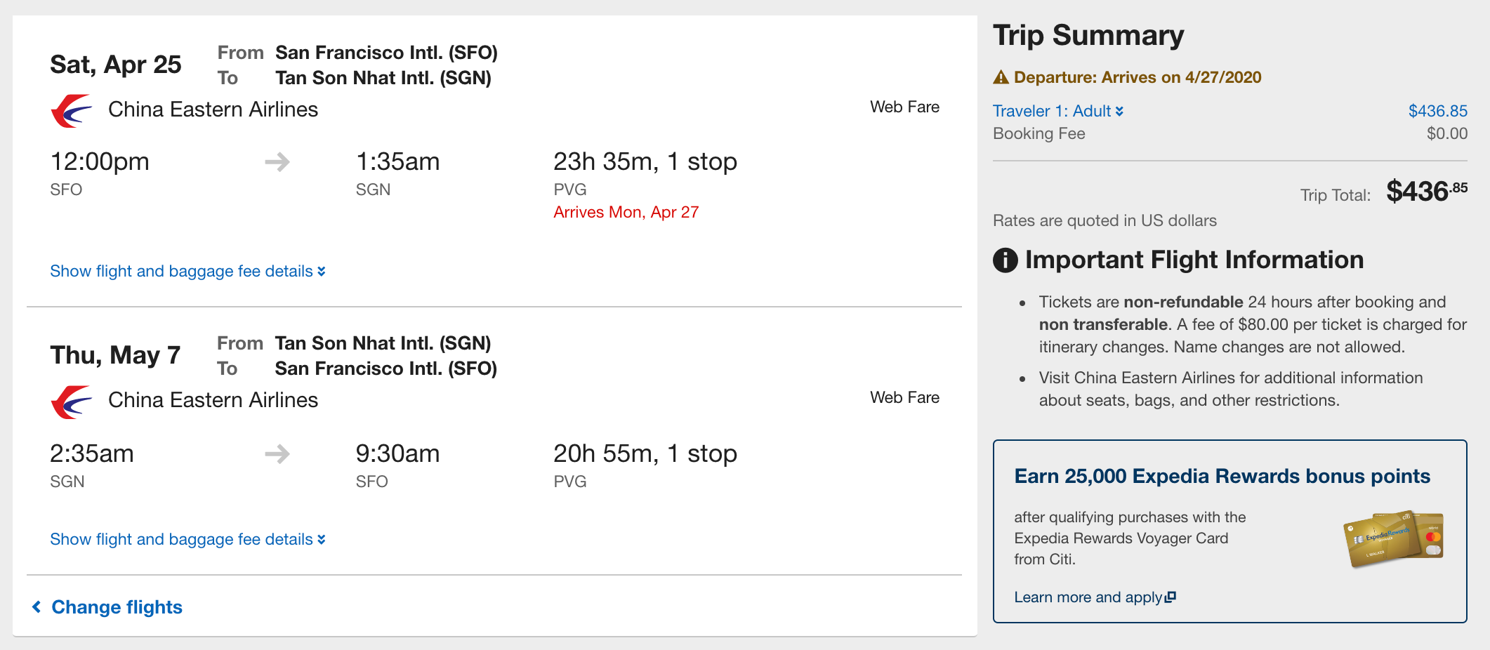 San Francisco (SFO) to Ho Chi Minh City (SGN) for $437 round trip on China Eastern via Expedia: