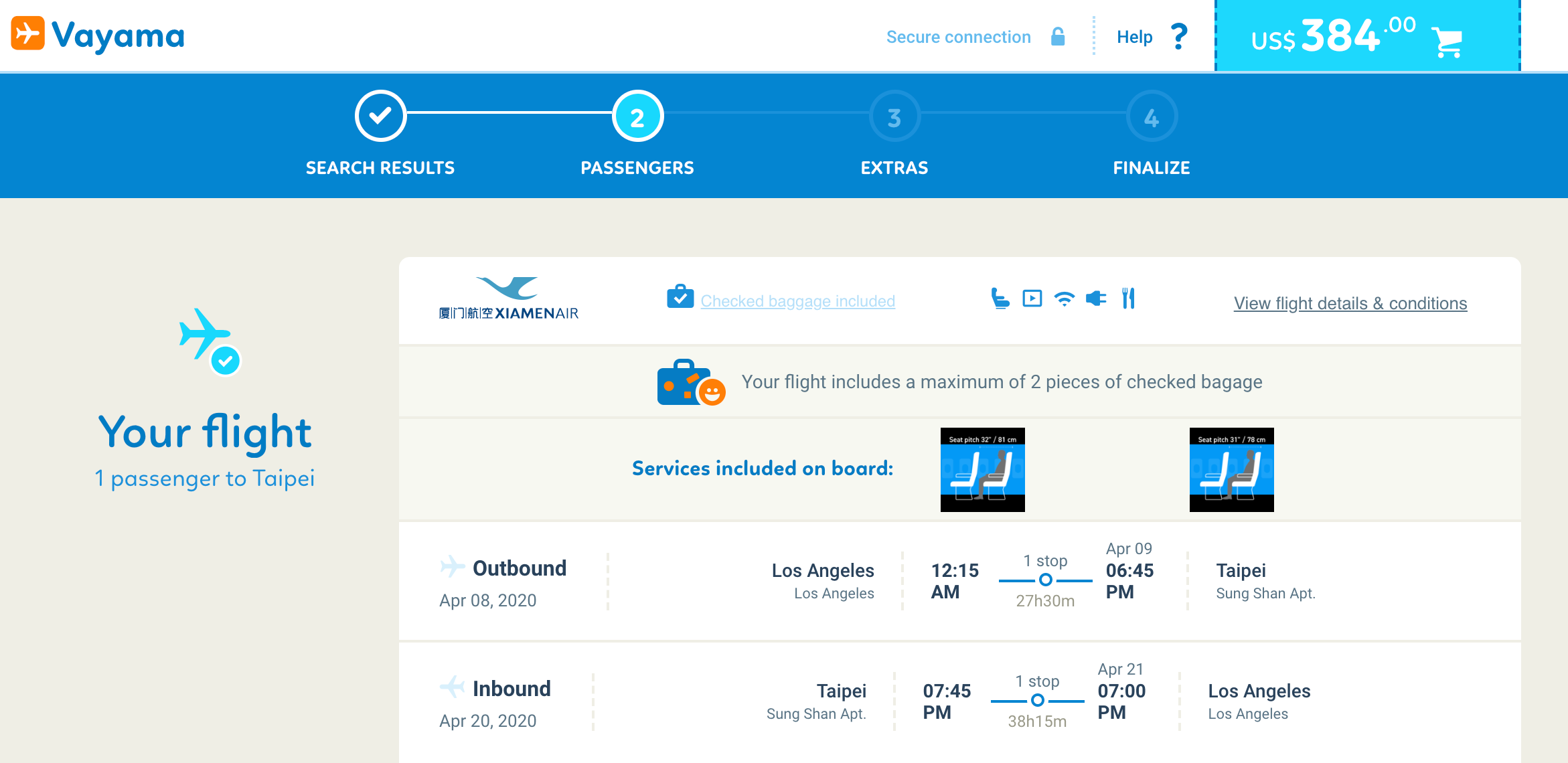 Los Angeles (LAX) to Taipei (TSA) for $384 round trip on Xiamen Air via Vayama: